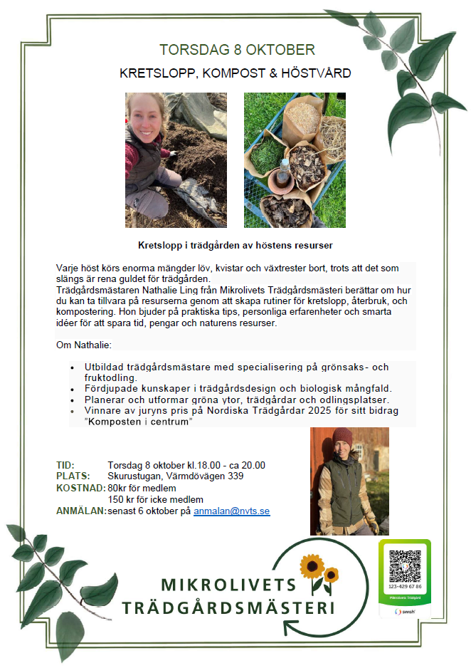 Föredrag av Nathalie på Mikrolivets Trädgårdsmästeri 8 oktober 2026 Av Helena den 9 december, 2025 Evenemangsdetaljer Datum: 8 oktober, 2026 18:00 – 20:00 Lokal: Skurustugan Anmäl dig här: anmalan@nvts.se Föredrag av Nathalie på Mikrolivets Trädgårdsmästeri 8 oktober 2026 Föregående Trädgårdsbesök hos Elin i Saltsjö-Boo Nästa Hållbarhetsfestivalen 2026 Lämna ett svar Avbryt svarDu måste vara inloggad för att publicera en kommentar.